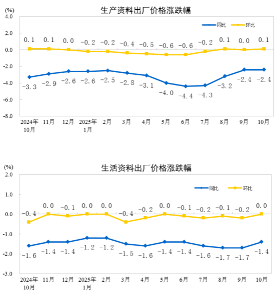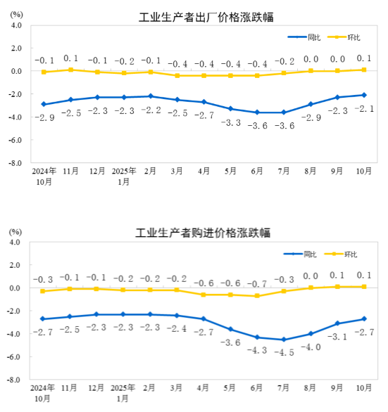 2025年10月份,全國(guó)工業(yè)生產(chǎn)者出廠價(jià)格同比下降2.1%,降幅比上月收窄0.2個(gè)百分點(diǎn);環(huán)比由上月持平轉(zhuǎn)為上漲0.1%。工業(yè)生產(chǎn)者購(gòu)進(jìn)價(jià)格同比下降2.7%,降幅比上月收窄0.4個(gè)百分點(diǎn);環(huán)比上漲0.1%,漲幅與上月相同。1—10月平均,工業(yè)生產(chǎn)者出廠價(jià)格比上年同期下降2.7%,工業(yè)生產(chǎn)者購(gòu)進(jìn)價(jià)格下降3.2%。